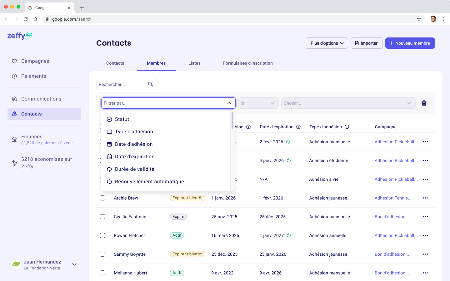 Un nouvel onglet Membres apparait maintenant dans votre section Contacts. Filtrez par statut, type d'adhésion, date d'inscription, expiration, renouvellement automatique et plus - vous savez toujours qui est actif, qui arrive à échéance et qui a besoin d'un petit rappel.