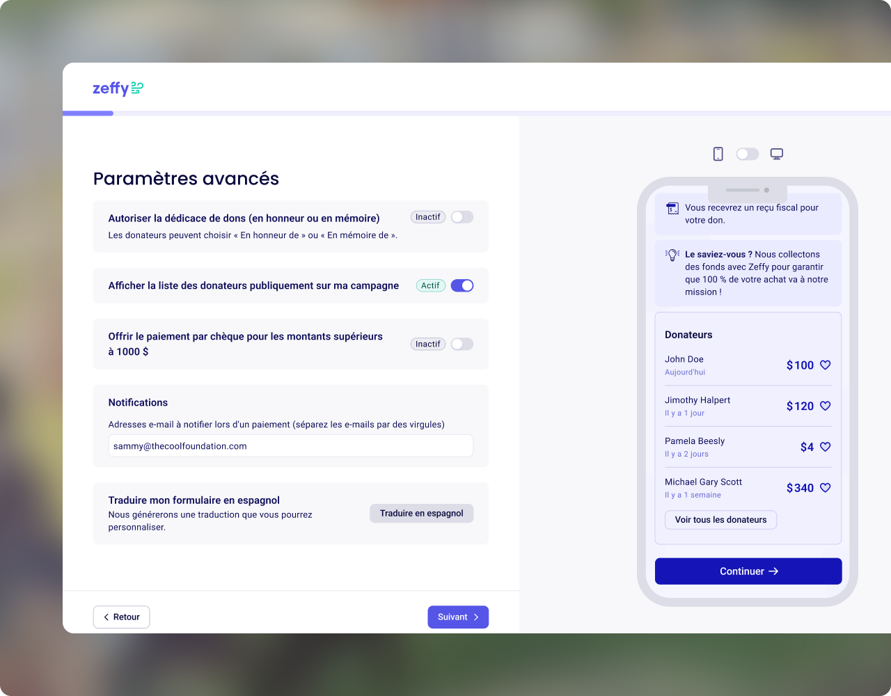 Le thermomètre et la liste de donateurs sont maintenant séparés - activez l'un, l'autre ou les deux, c'est vous qui décidez. « En l'honneur de » et « À la mémoire de » sont clairement distingués, pour toujours savoir quel message envoyer. Chaque paramètre vient avec son explication intégrée.