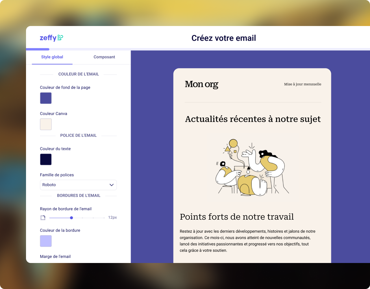 Glissez-déposez des blocs, choisissez un modèle et envoyez des courriels à l'image de votre organisme - sans jamais quitter Zeffy.
