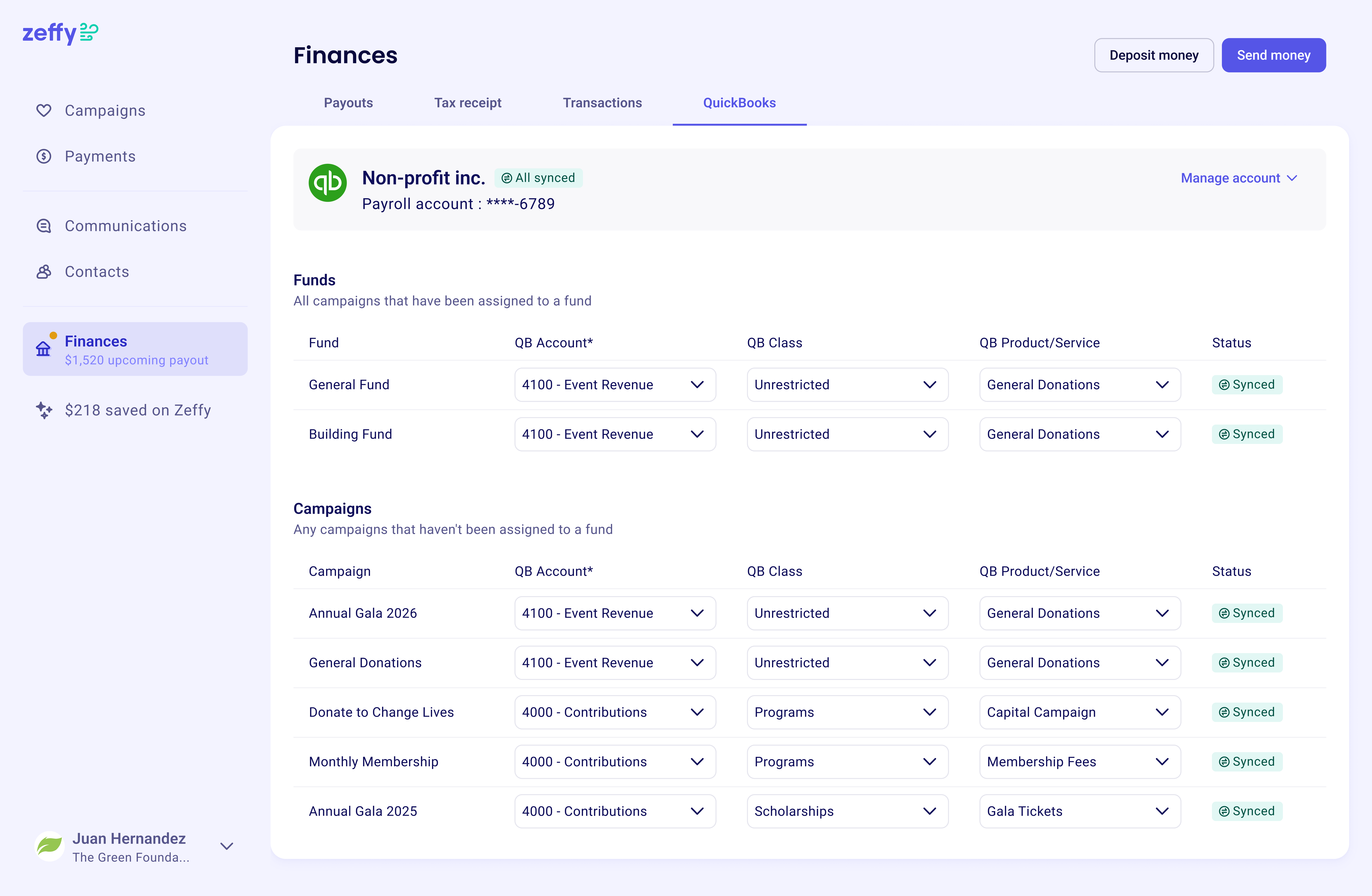 Zeffy's QuickBooks integration automatically categorizes every payout by campaign, fund, and income amount.
