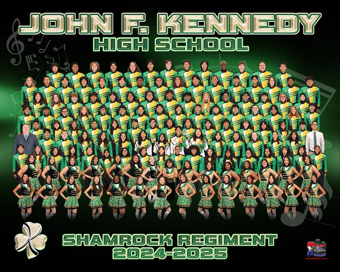 The John F Kennedy Band Boosters, also known as the Shamrock Regiment, supports the John F. Kennedy High School band program in La Palma, CA, since 1983. They provide resources and support for the band's activities and performances.